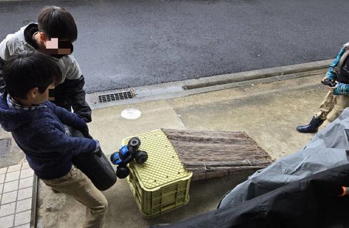 これ、先日のお休みで雨でも何かやりたそうだったので使い古したすだれを坂にしたら面白くない?って水を向けたら…まあアイデア爆発してました。